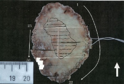 胃ESD 小田 一郎先生 症例 肉眼型:Ⅱc(表面陥凹型) 深達度予測:M コメント:体下部後壁の25㎜大の0-Ⅱc病変に対してESD施行。順調に一括切除され止血追加して終了。 病理診断 Stomach(ESD):Well differentiated adenocarcinoma(#5-15,23-29) [0-IIc,27×23㎜,tub1(高異型度癌),M,ly0,v0,低分化型化なし,UL(-),LM(-),VM(-)]