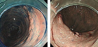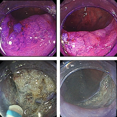 クリスタルバイオレット染色では、辺縁がⅢ-Ⅳ型pitで中心部はやや不整な小型pitを認めており、早期大腸癌と考え、ESDで一括切除した。