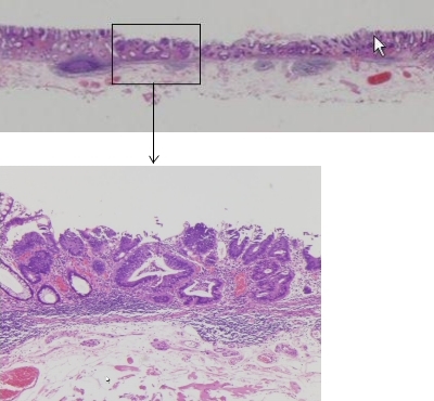 病理では、Well differentiated adenocarcinoma(pM.ly0,v0,pHM0,pVM0) in tubular adenoma(moderate to severe atypia)