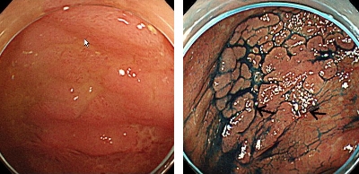 病変口側及び病変内に前医生検後と思われる瘢痕(矢印)を認めている。
