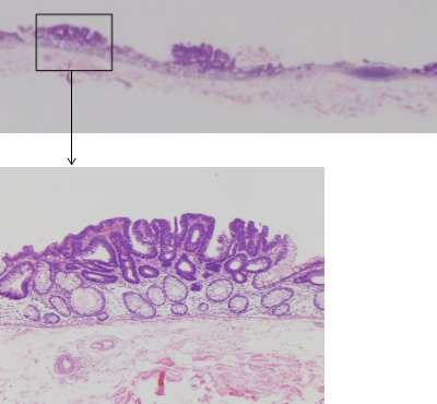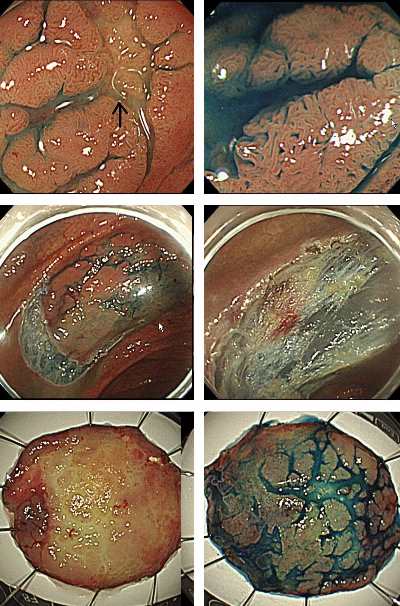 病変を近接拡大するとⅣ型pitを主体とする病変であり、腺腫を疑ったが瘢痕を伴う病変で、前医局注でnon lifting でありESDを施行した。